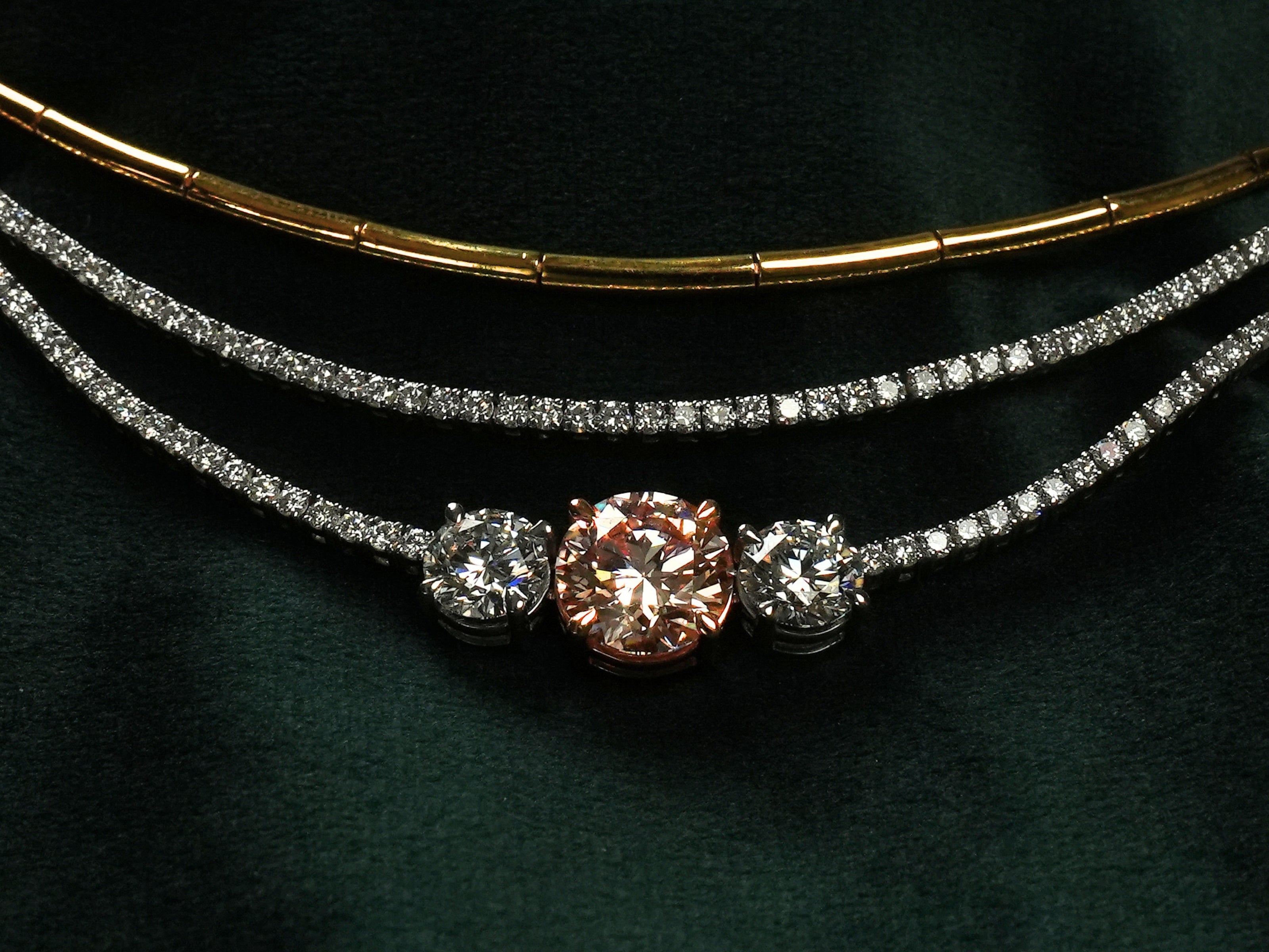 Two-Tone Necklace in 14K Champagne & White Gold with a Pink Round Solitaire and White Diamond layering,