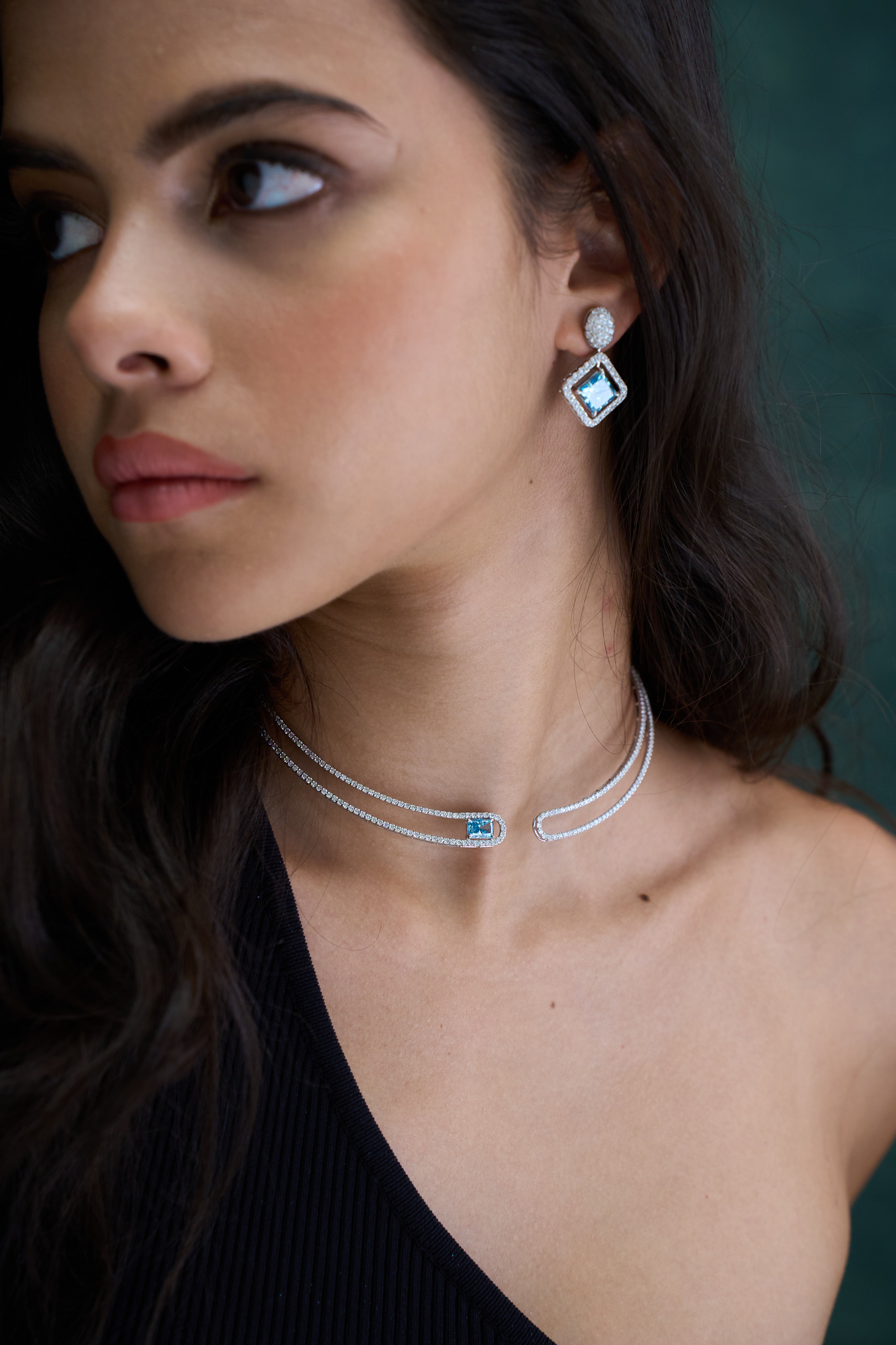 Dangling Earring in 14K White Gold with Princess-Cut Blue Solitaires suspended on an Angular Drop,
