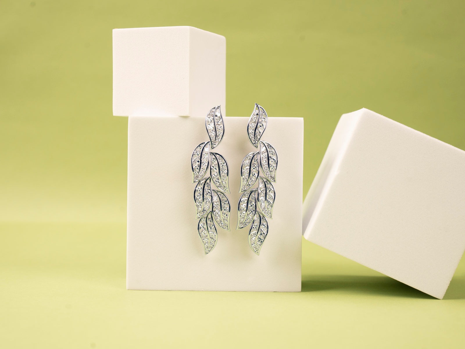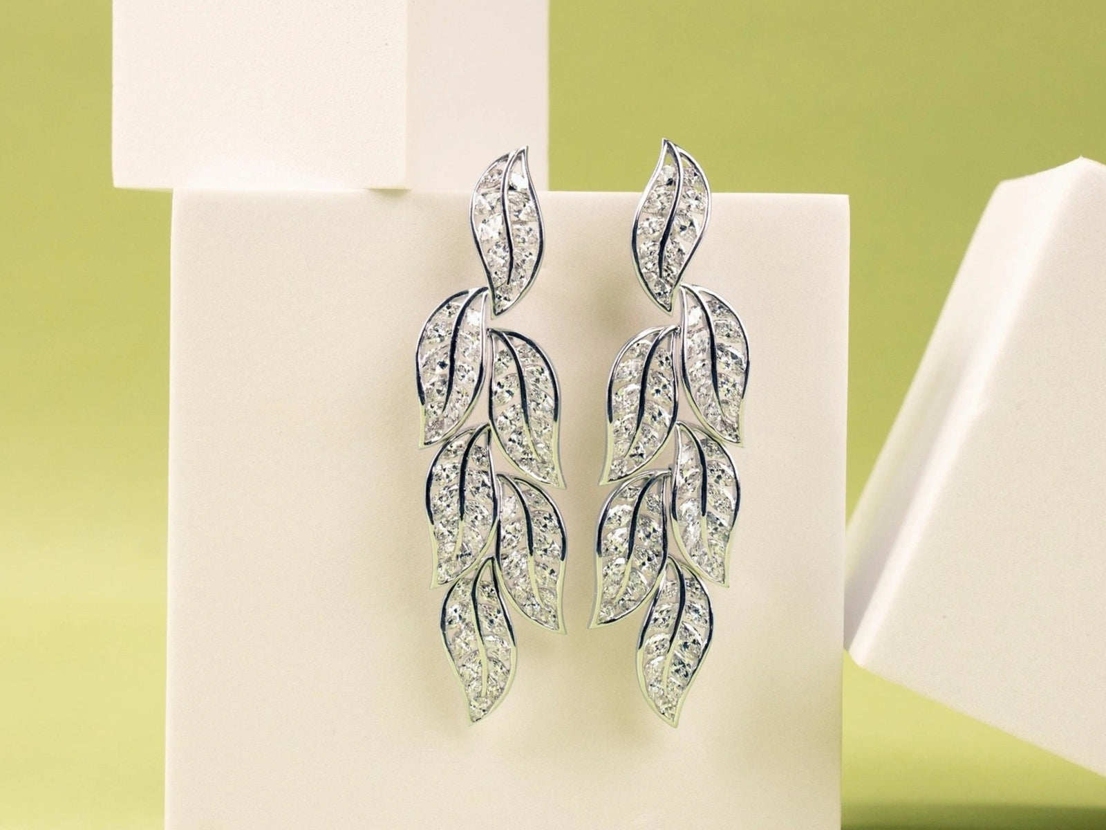 Leaf Shaped Earring in 14K White Gold with a cascading formation of Marquise- Cut Diamonds,
