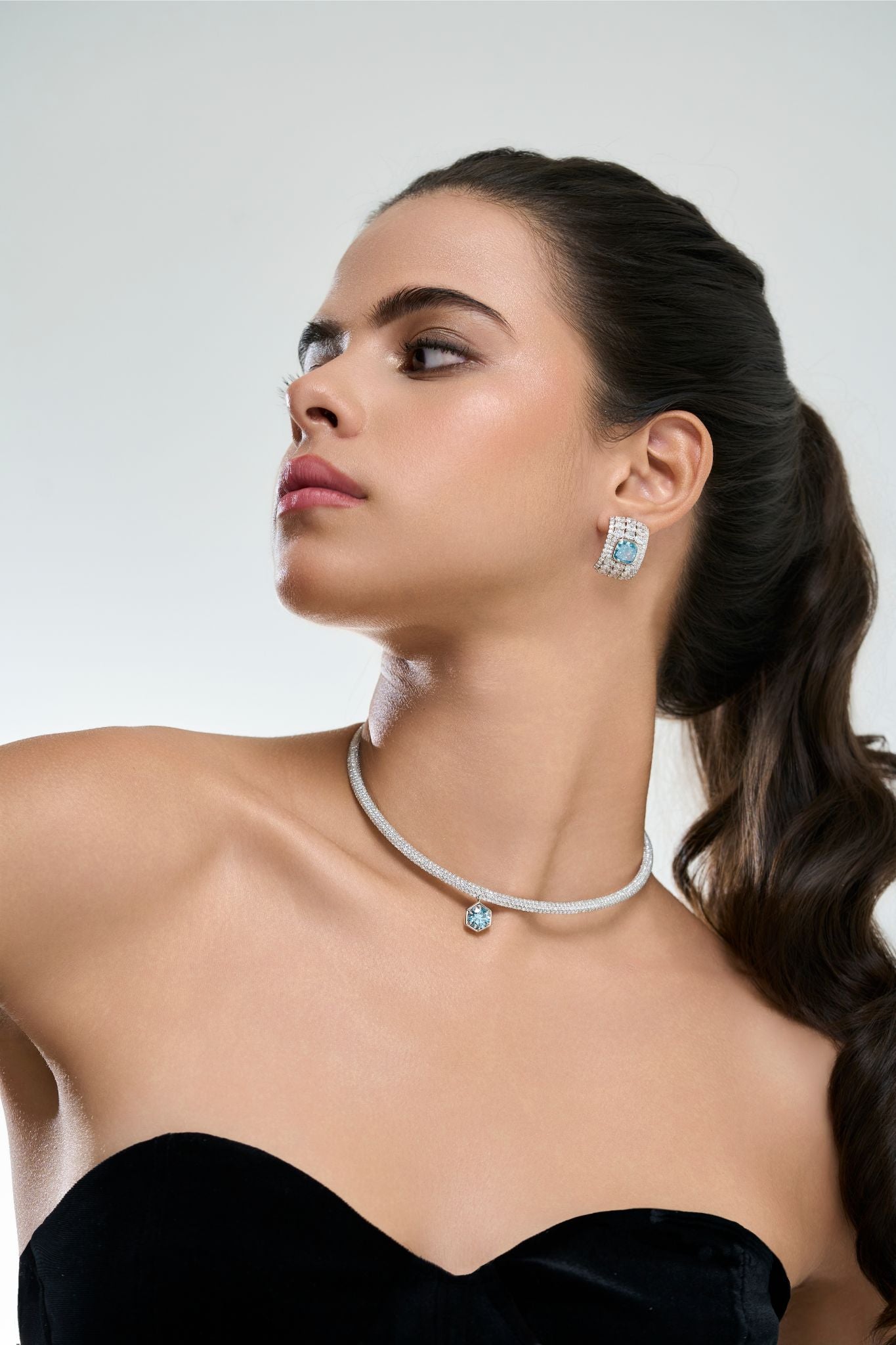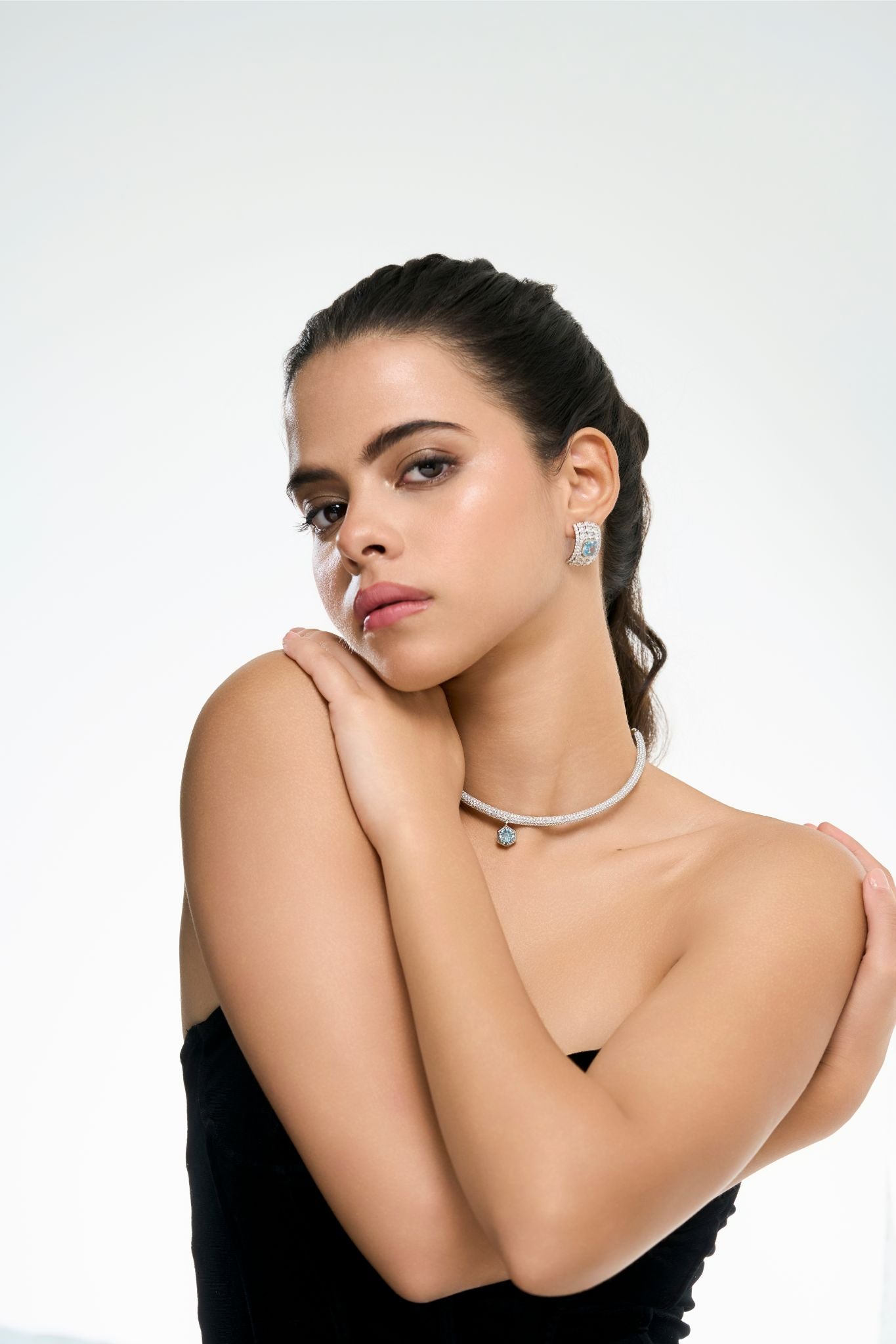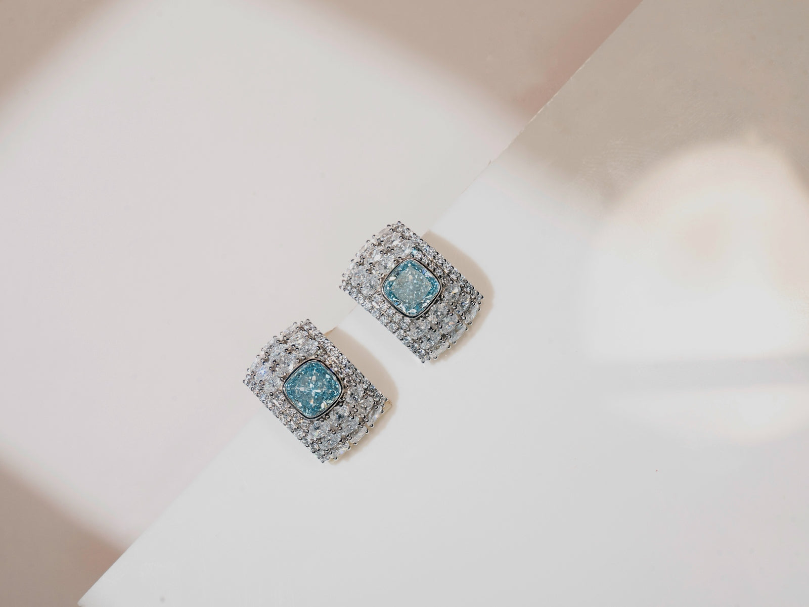 Tightly Curved Earring in 14K White Gold with Blue Cushion Solitaires accented with Diamonds,