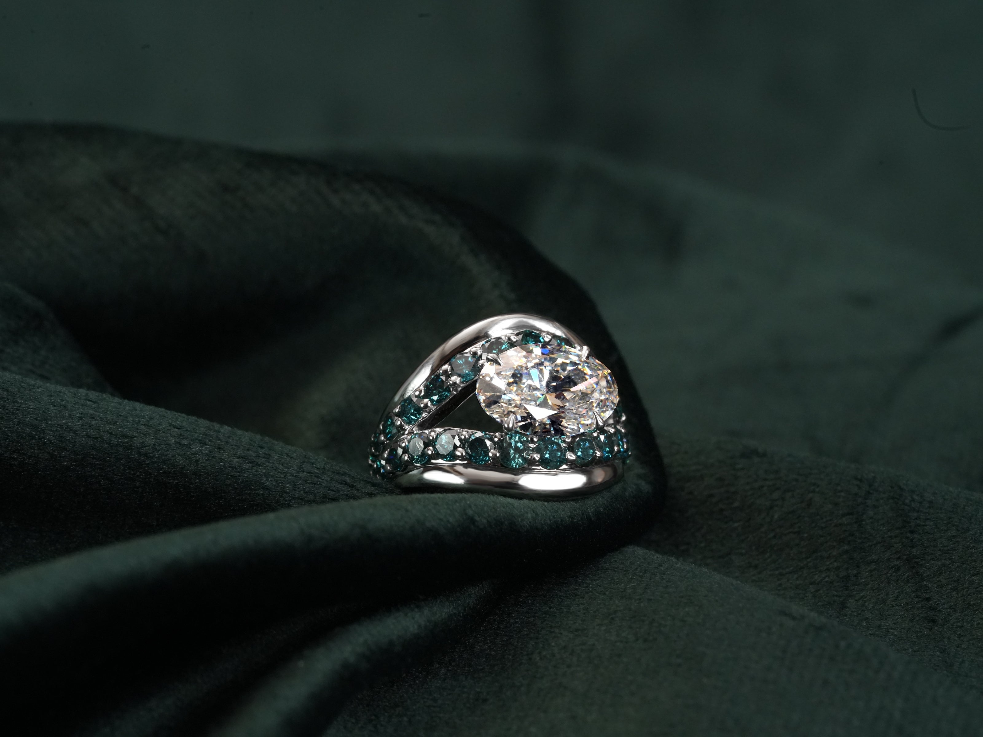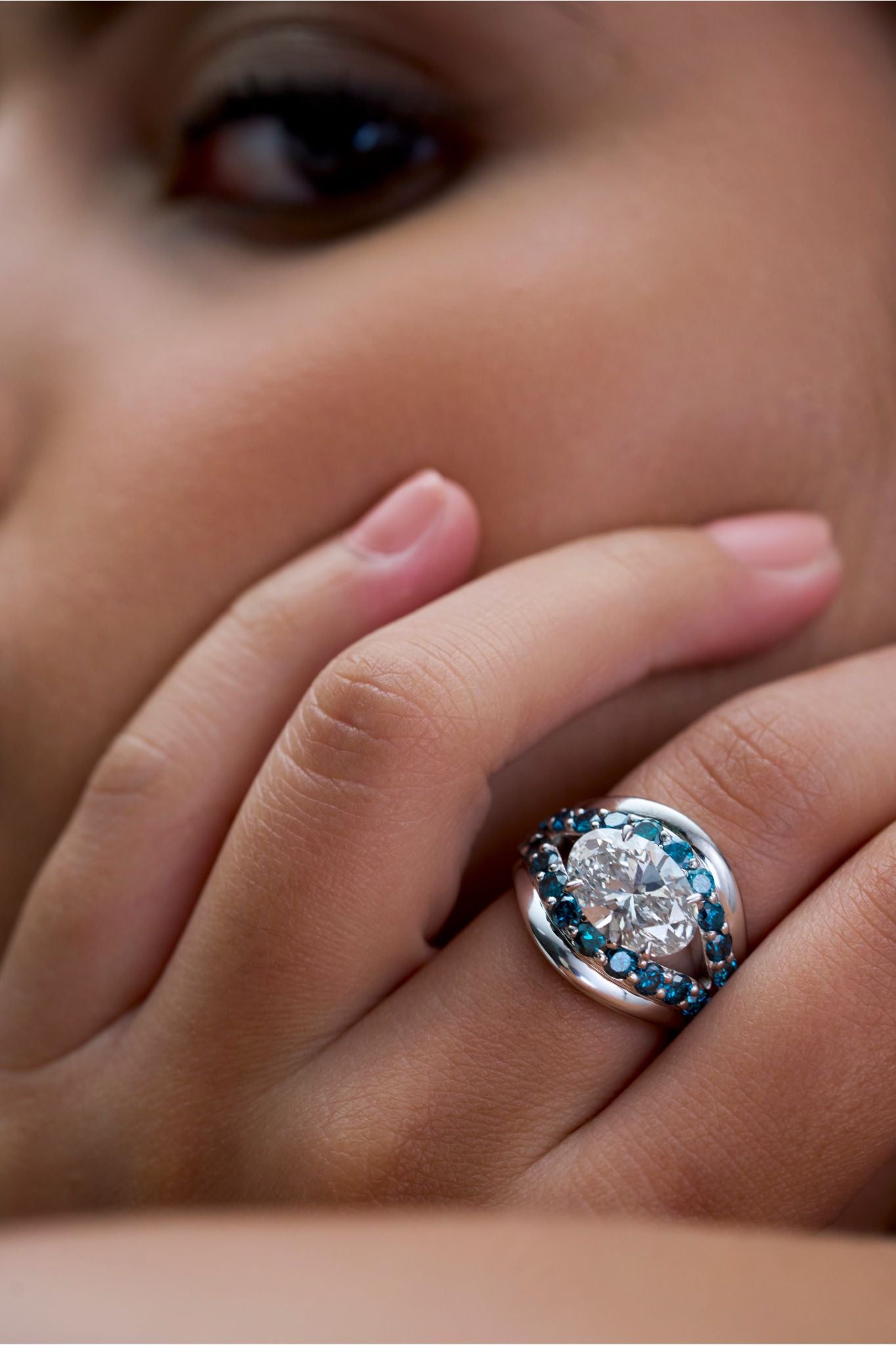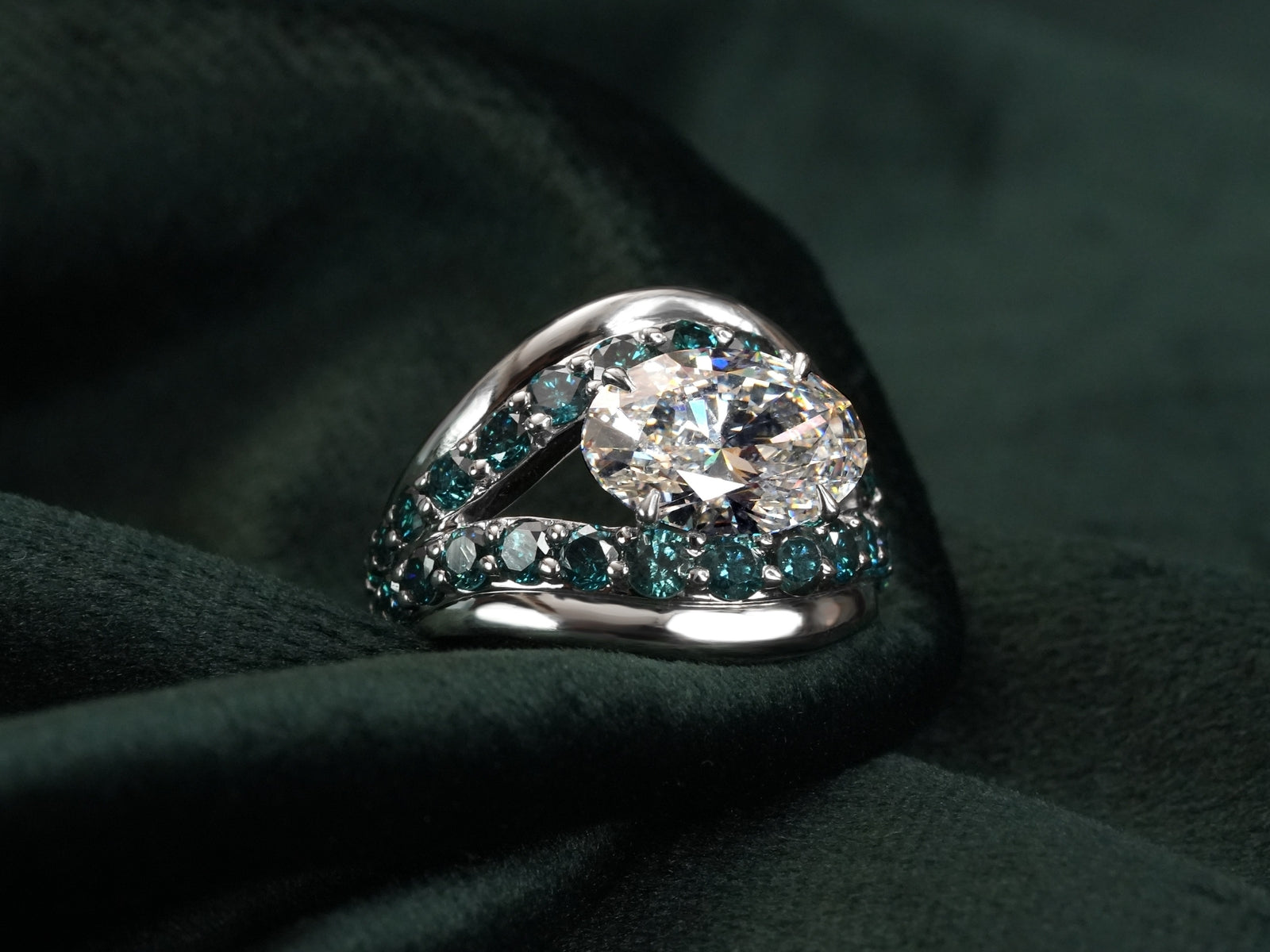 Protection-Inspired Ring in 14K White Gold with an Oval solitaire and surrounded by Blue Diamonds in an Evil Eye Shape,