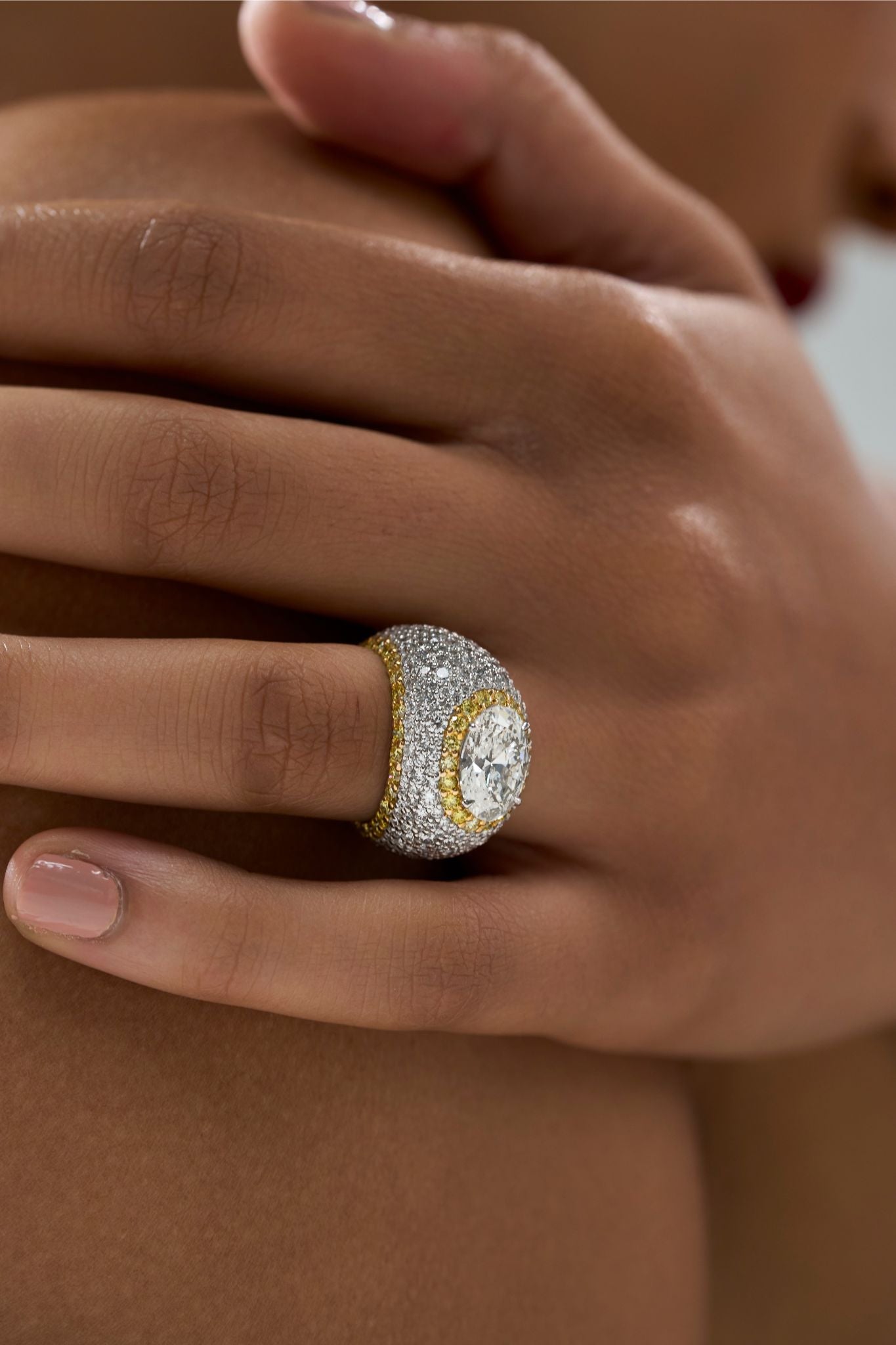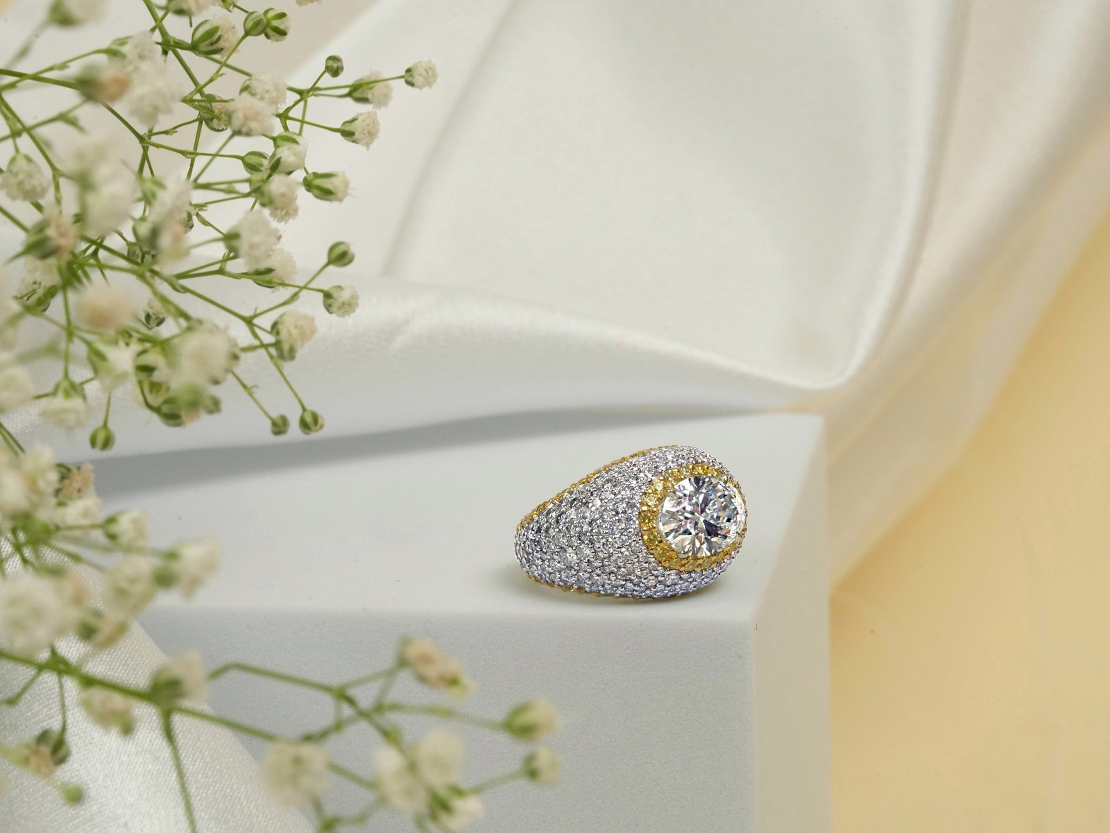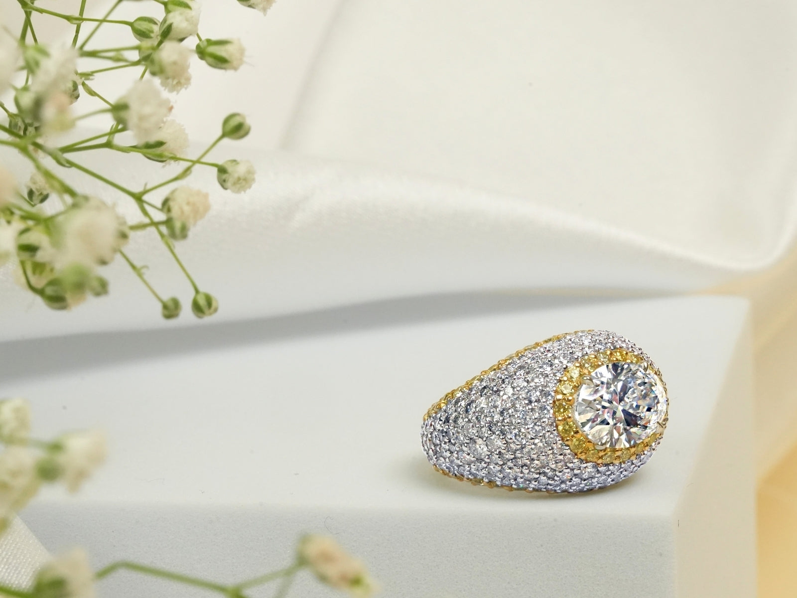 Ornate Ring in 14K White Gold with an Oval Solitaire flanked by Yellow Diamonds in a wide Pavé Base,