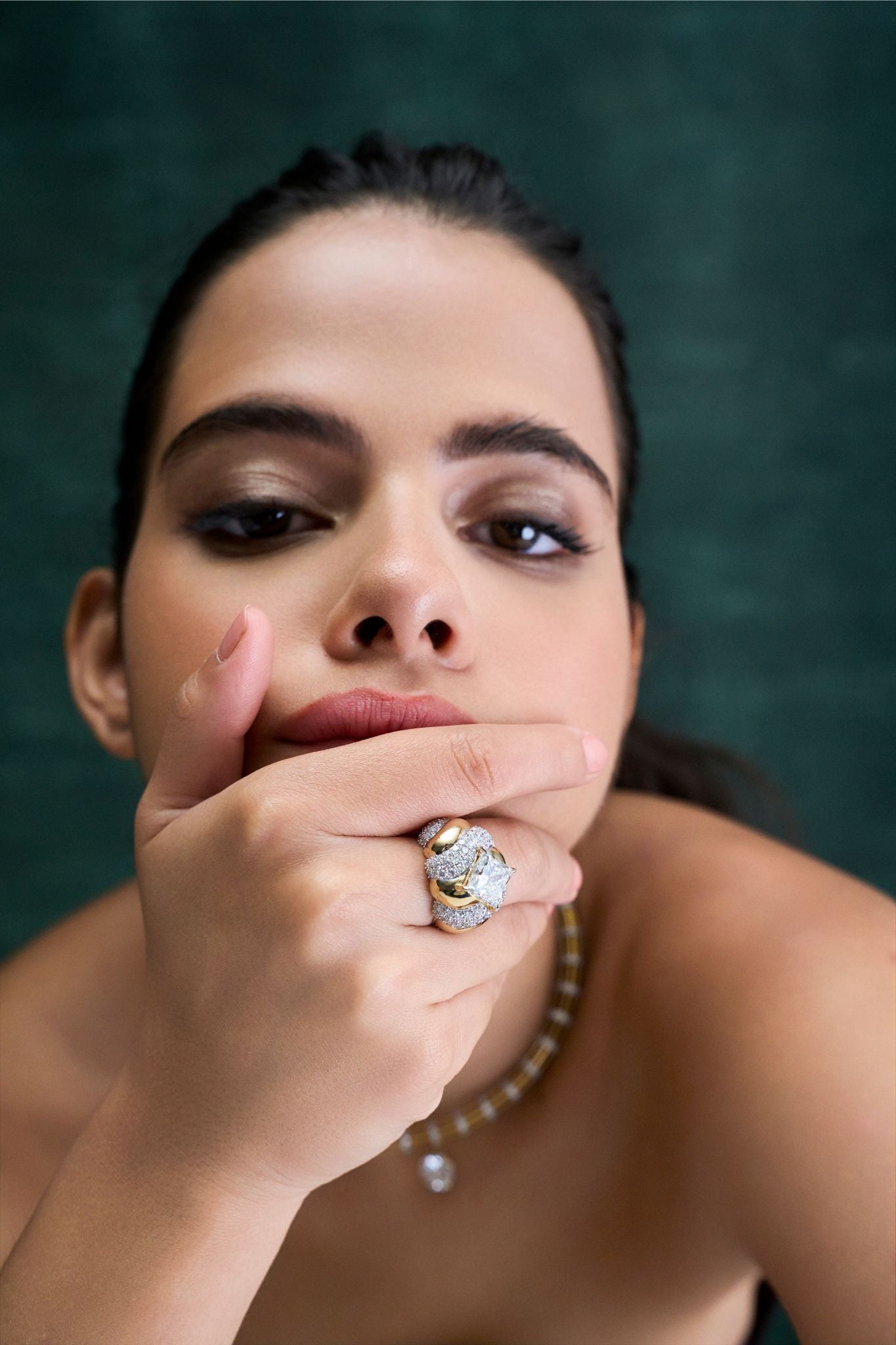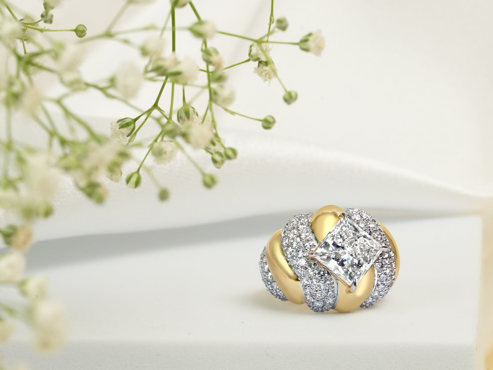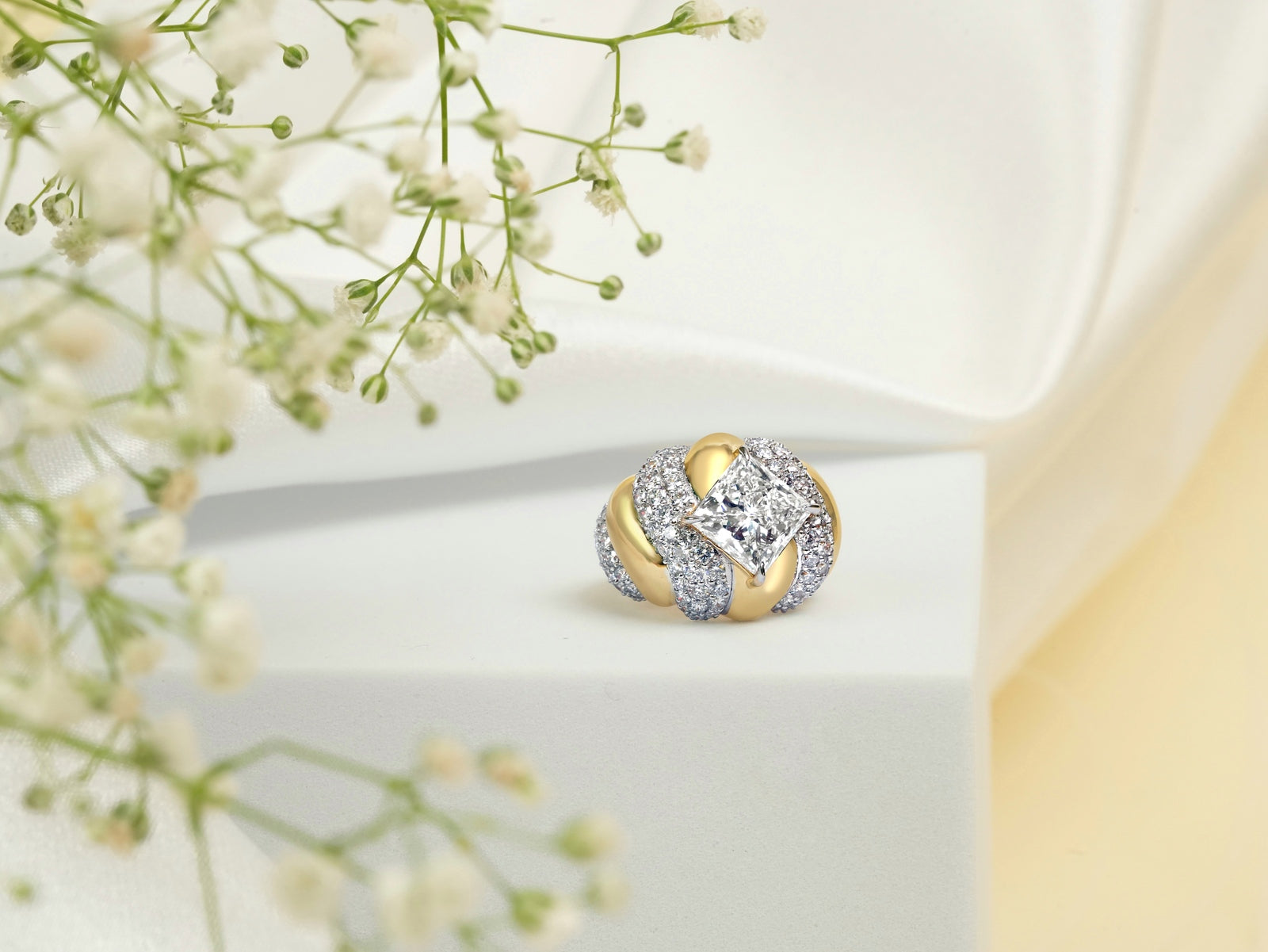 Statement Ring in 14K Champagne Gold with a Large Princess-Cut Solitaire and Pavé-Set Diamonds,